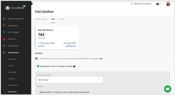 2020. В EasyWeek реализовали удобное пополнение баланса и просмотр истории SMS-уведомлений